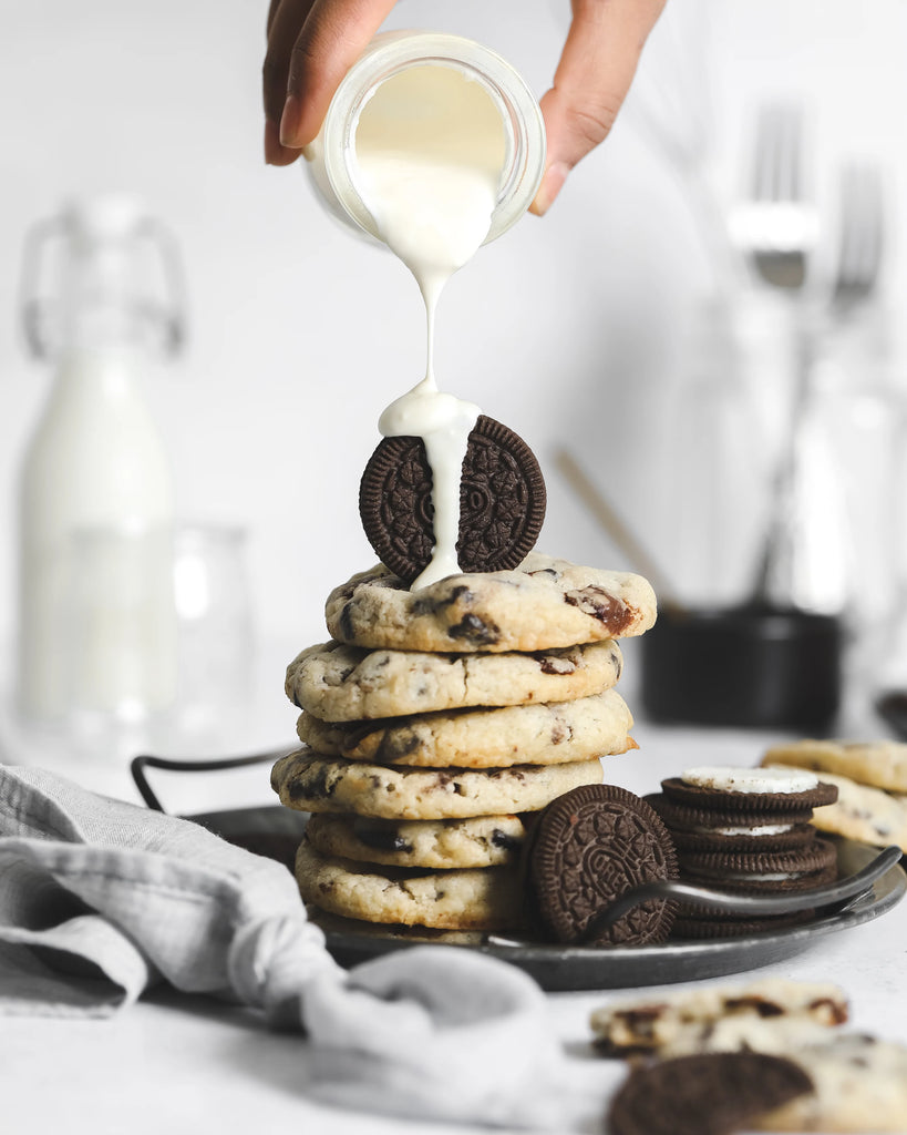 - Butter, cream cheese, sugar, vanilla essence, flour, chocolate chips, Oreos, baking powder